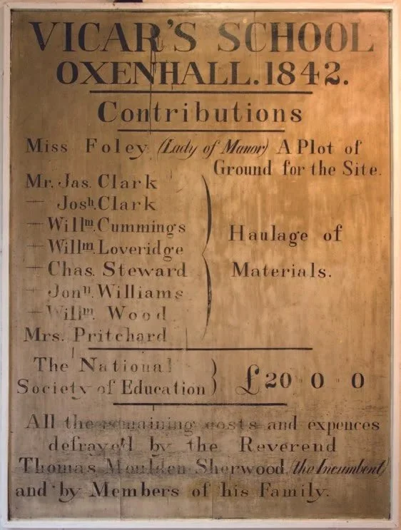 First established in 1842 in association with the National Society, in a building donated by Lady Elizabeth Foley on their estate close to the church, Oxenhall Vicar’s School drew its income from subscriptions and in 1847 had 21 boys in attendance. However by 1868 it had closed, presumably through lack of funds.